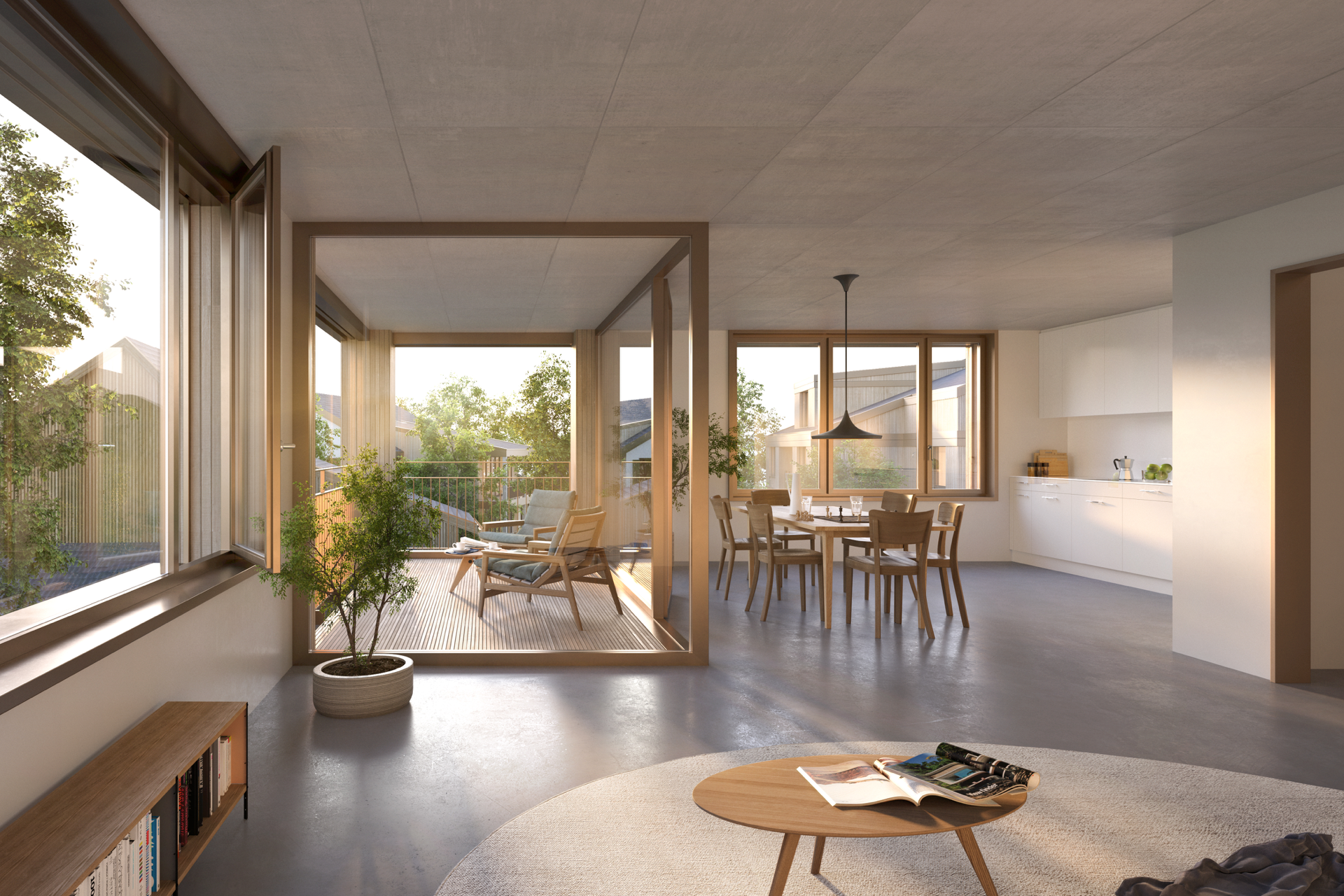 Robuste Materialien wie Sichtbeton, geschliffene Anhydritböden und fein verputzte Wände bestimmen die Wohnräume. Im Mehrzwecksaal setzen Holzverkleidungen und Akustikdecken warme Akzente, während das integrierte Tragwerk klare Raumformen ermöglicht. Die Küchen und Bäder verfügen über einen guten und üblichen Komfort, ausreichend Stauraum und pflegeleichte Materialien.