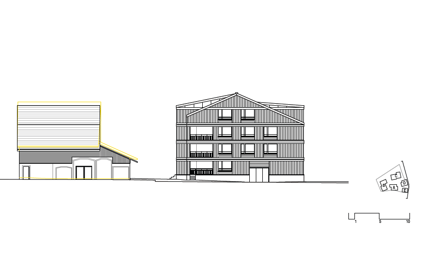 Zentral für den Charakter der neuen Überbauung sind die Dachformen und das Zusammenspiel unterschiedlicher Materialien, welche eine harmonische Siedlung mit Charme entstehen lassen. Die Neubauten erhalten geneigte Satteldächer aus dunkelbraunem Aluminium mit integrierten PV-Anlagen. Fassaden aus lasiertem Holz, Holz-Metall-Fenstern und Rafflamellenstoren prägen das Bild. Der Mehrzwecksaal kombiniert Sichtbeton und dunkle Holzschalung, das Wohnhaus E verputzte Fassaden mit Ziegeldach und Kupferentwässerung.