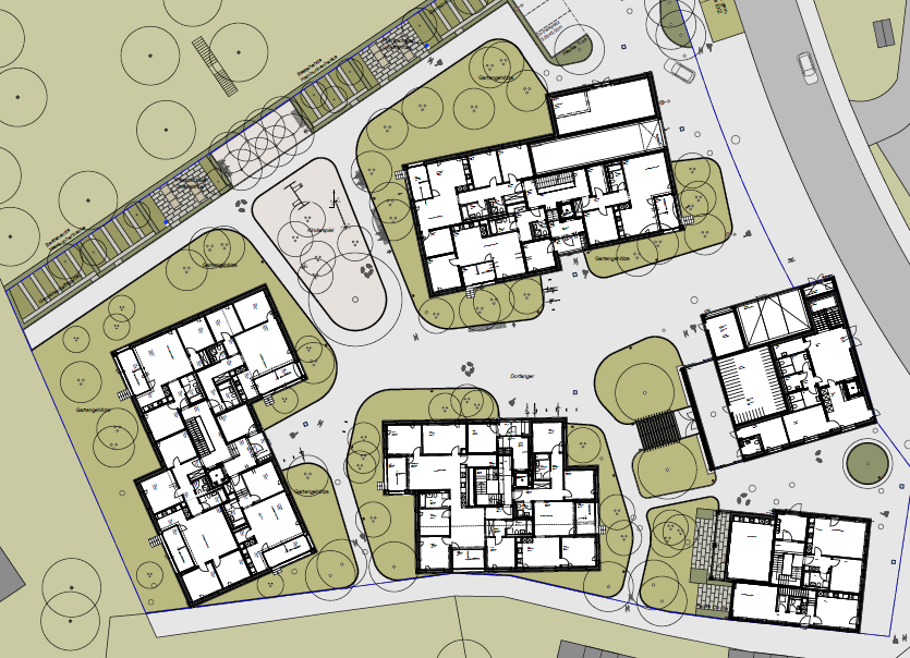 Die fünf Gebäude bilden einen dörflichen Innenhof als zentralen Begegnungsort mit Spielplatz, Gemeinschaftsraum und -gärten. Bestehende Nussbäume, eine neue Linde und Blumenwiesen schaffen eine grüne, naturnahe Atmosphäre. Die Gemeinschaftsgärten bleiben erhalten und stärken das «nachbarschaftliche Miteinander».